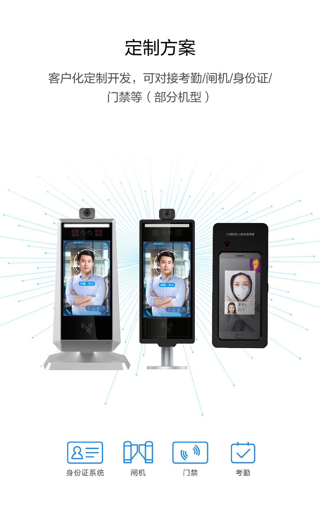 客户化定制开发,可对接考勤/闸机/身份证/ 门禁等(部分机型)