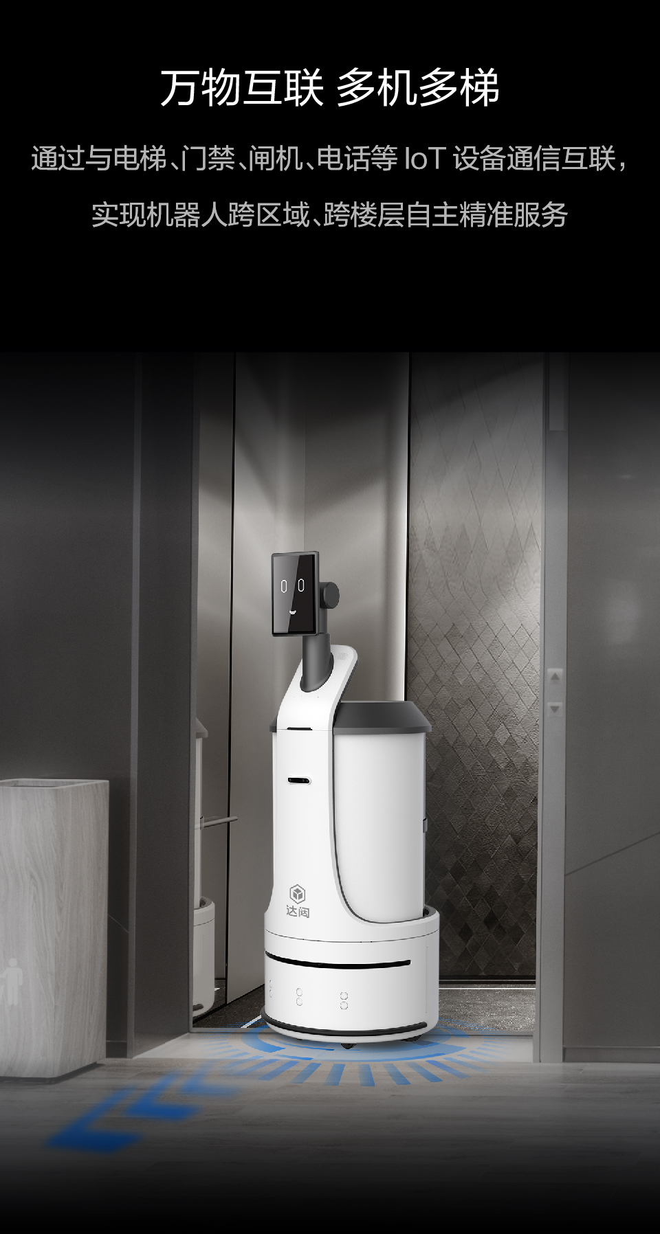 通过与电梯、门禁、闸机、电话等IoT设备通信互联,实现机器人跨区域、跨楼层自主精准服务
